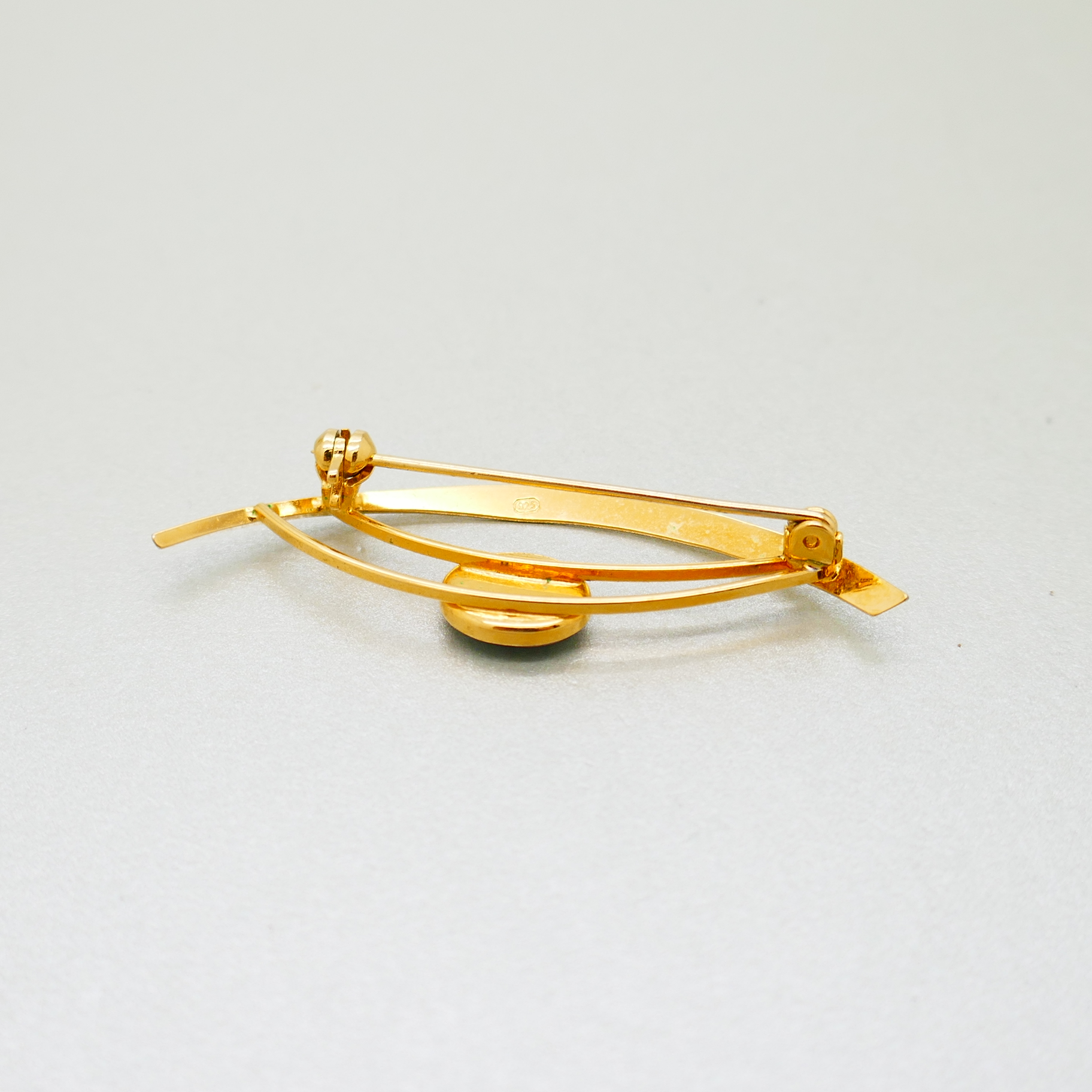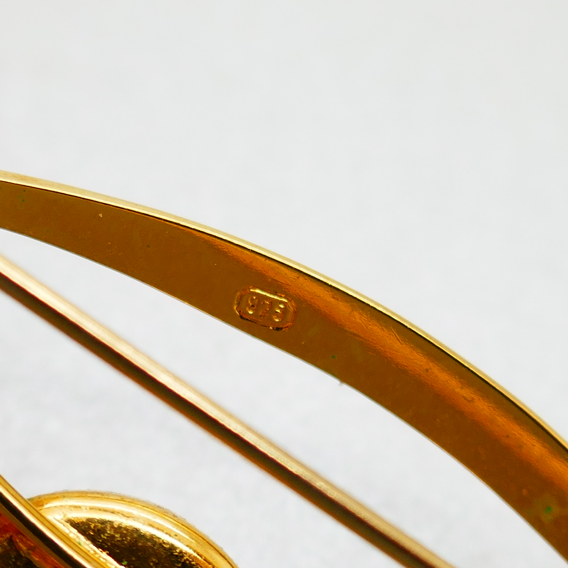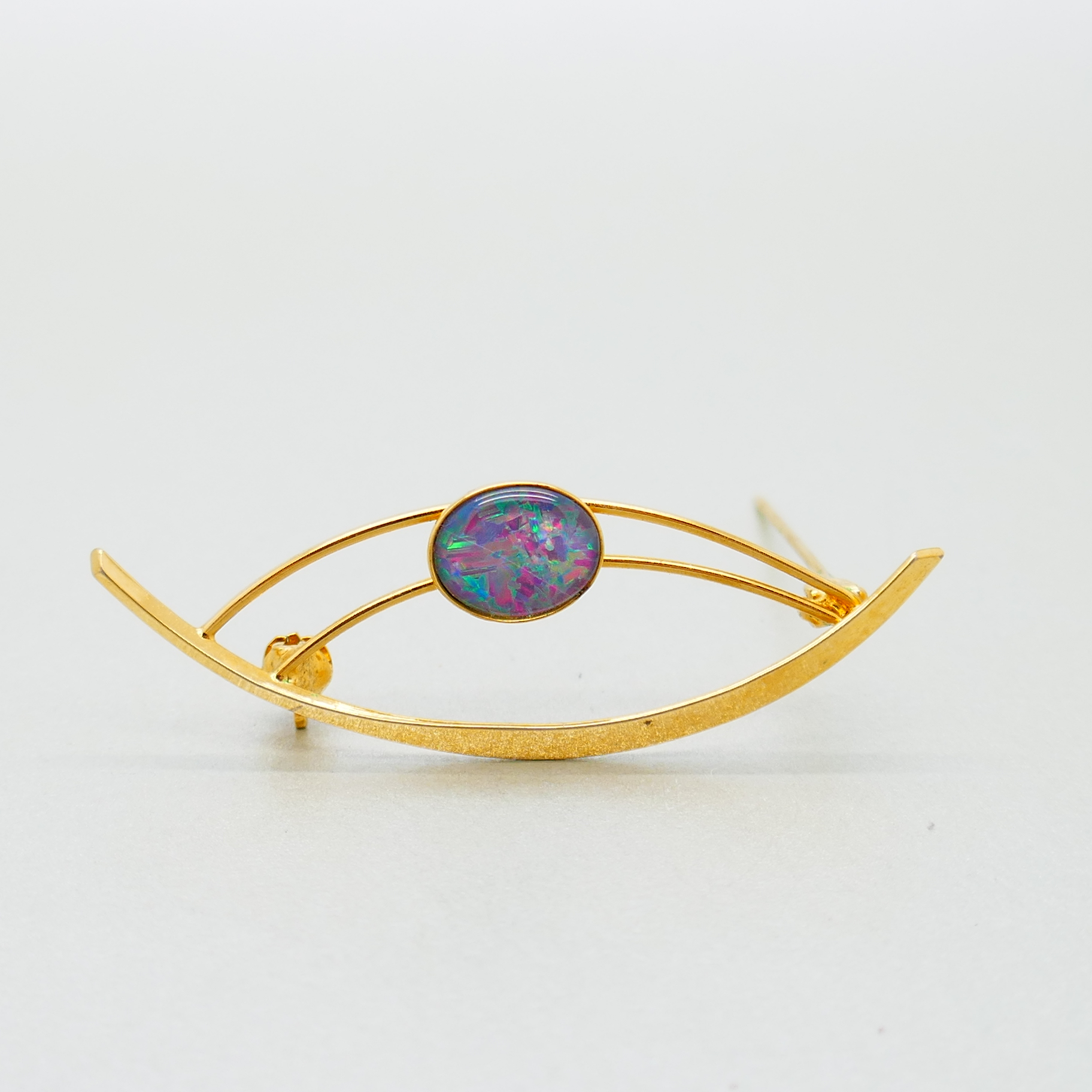 Een vintage verguld zilveren broche bezet met een Australische opaal triplet. De opaal heeft een topkleur en het hele oppervlak is gevuld met kleur. Met name rood springt eruit.
