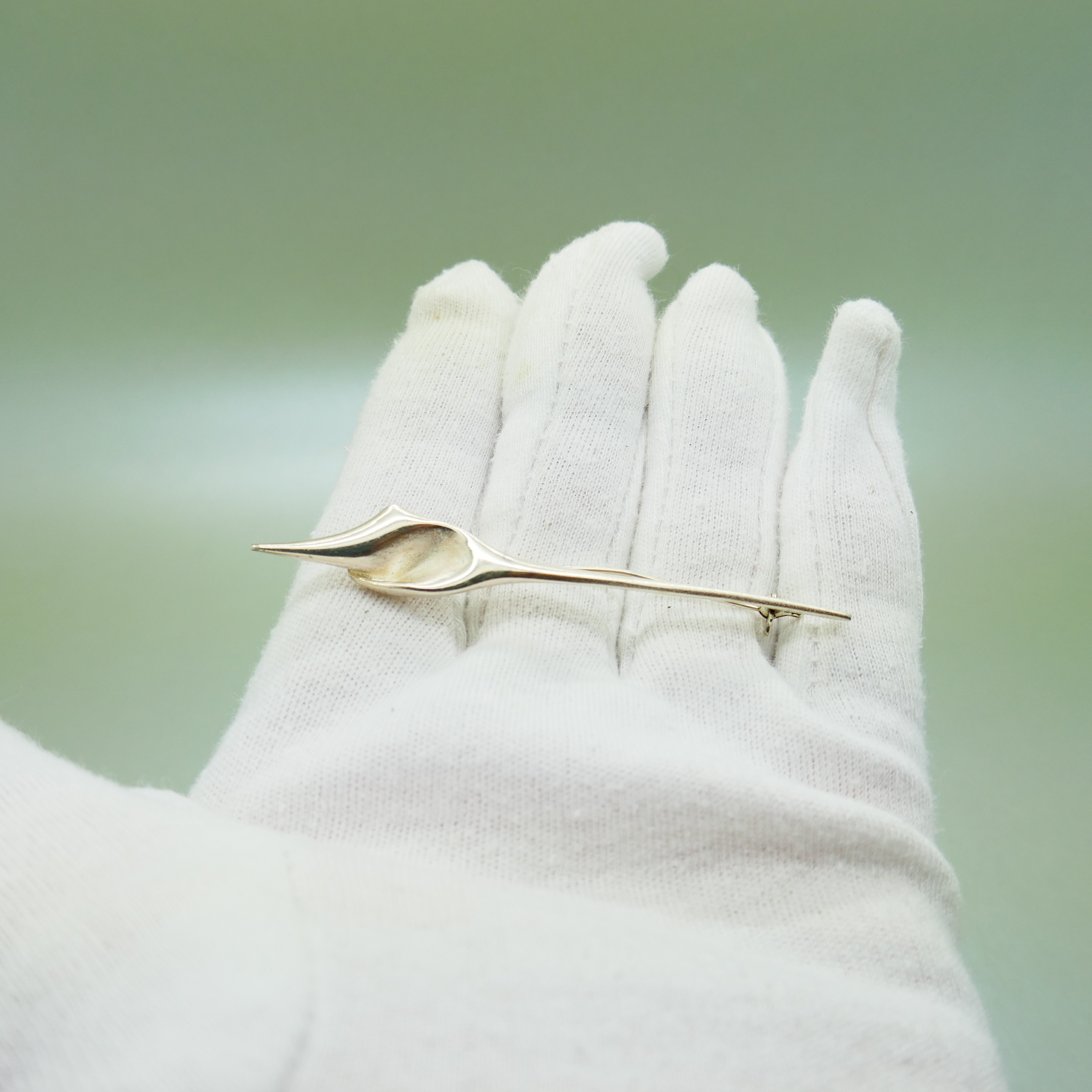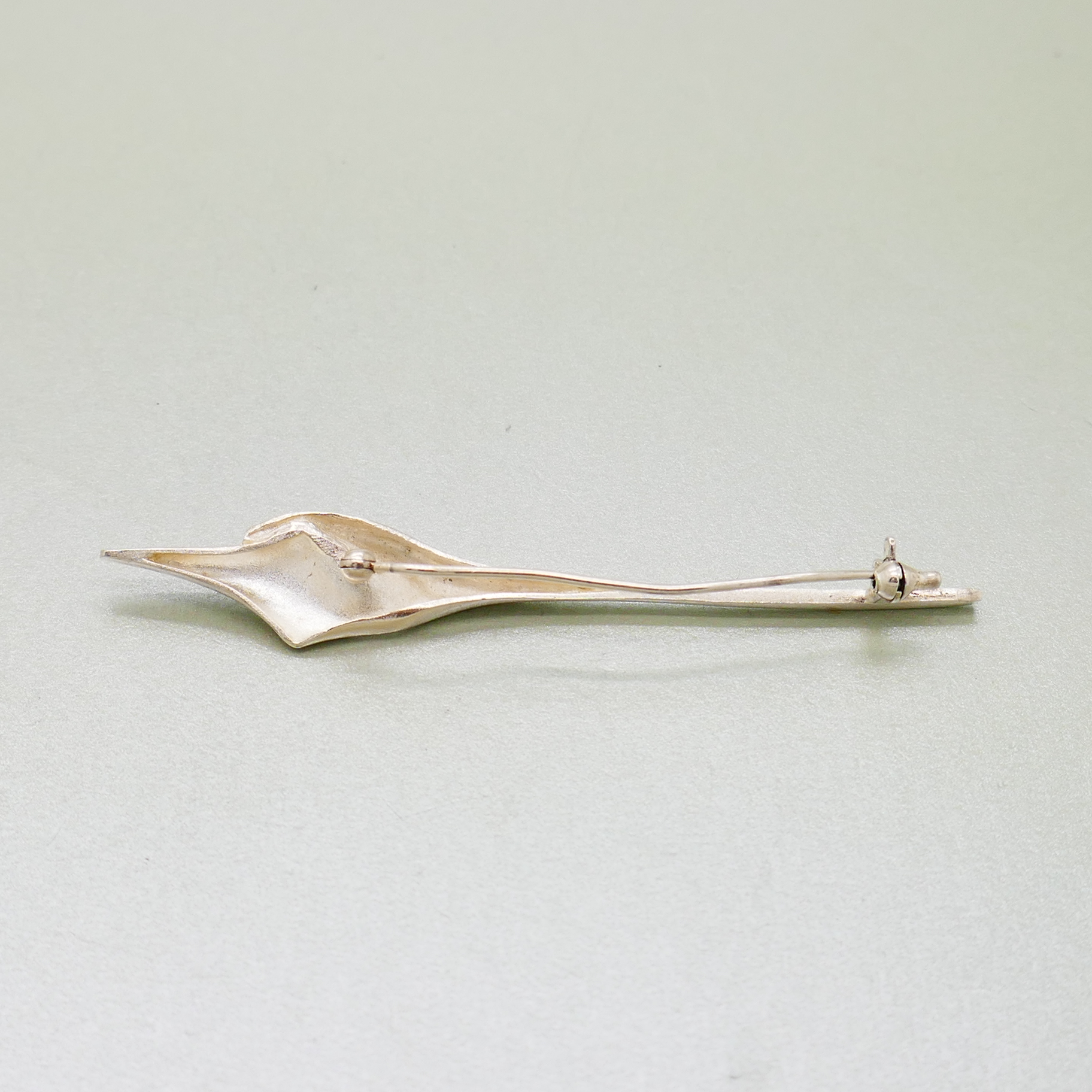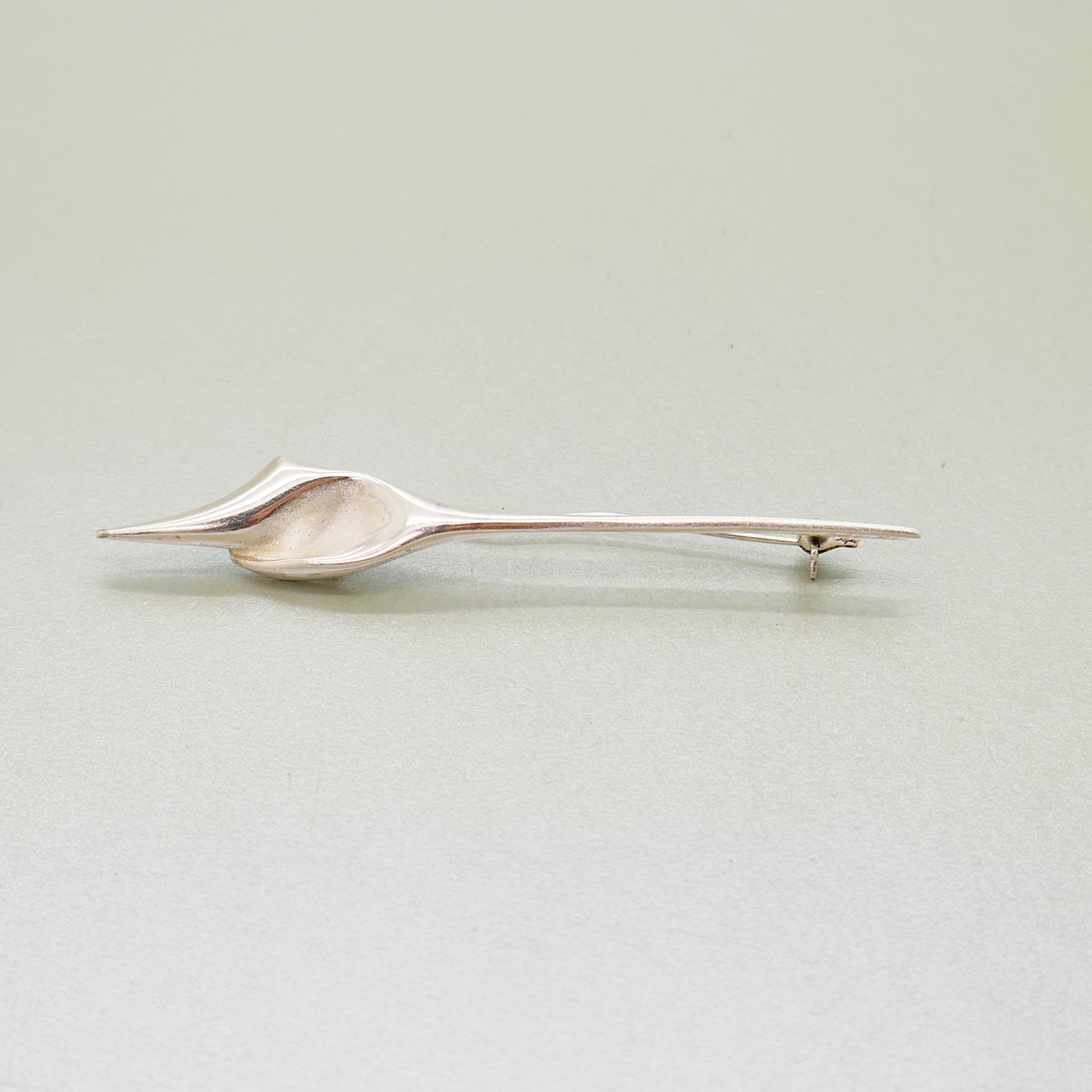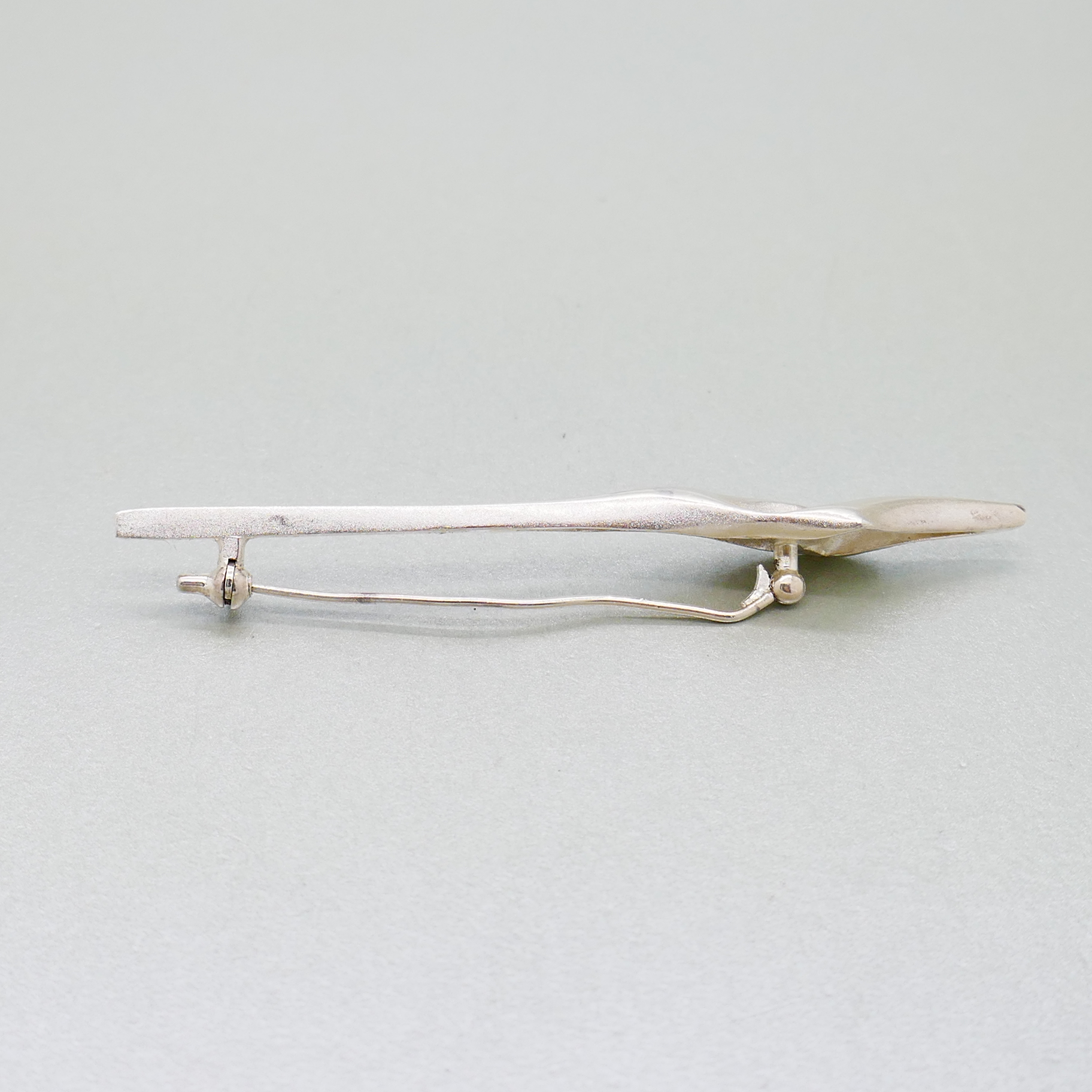 Een vintage zilveren broche van de bekende ontwerper Matti J Hyvärinen. Matti Hyvärinen (1937-2017), sieraadkunstenaar en goudsmid, heeft diverse internationale prijzen gewonnen. Hij heeft o.a. ontworpen voor de firma Sirokoru. Deze broche toont een gestileerde toorts, mogelijk een Olympische vlam. De broche is gesigneerd met handtekening, MJH en 925S
