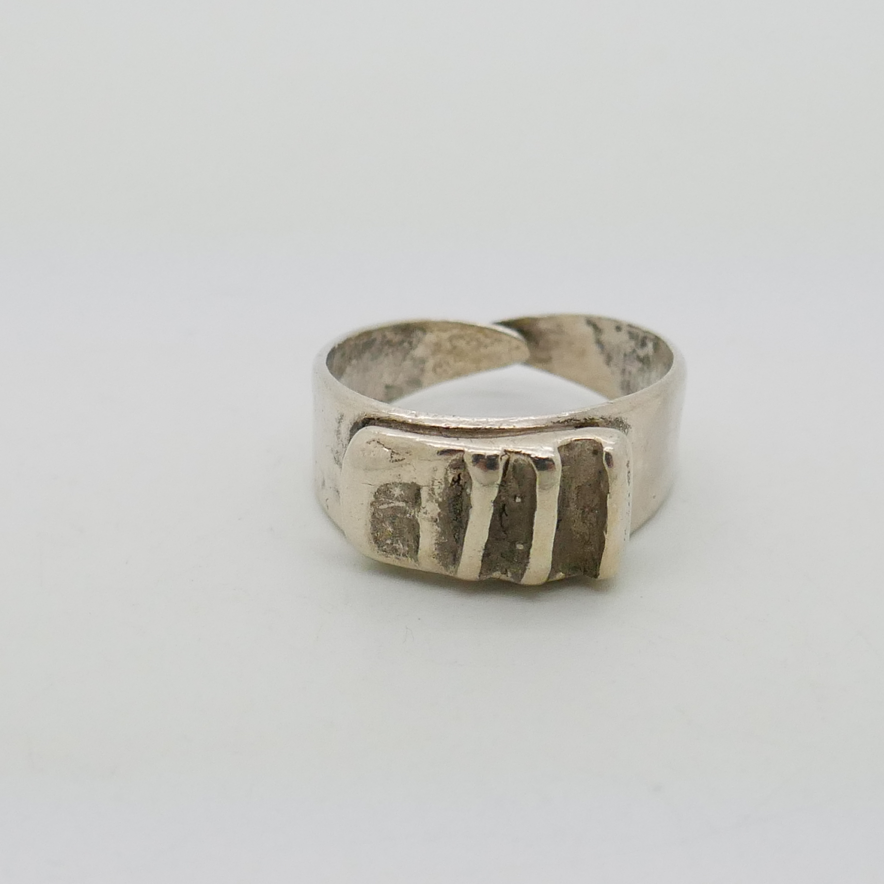 Een zilveren ring van Menno Meijer met een modernistische vormgeving.
