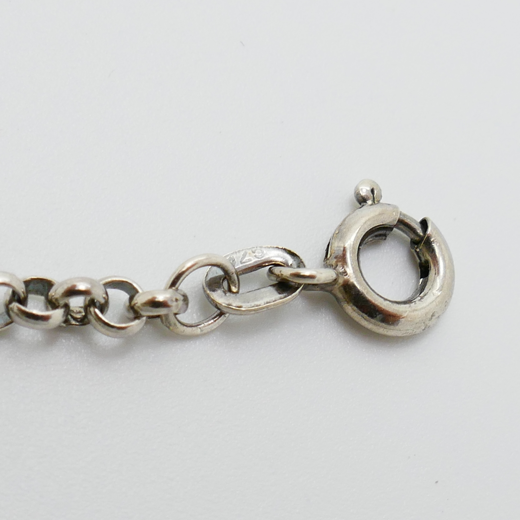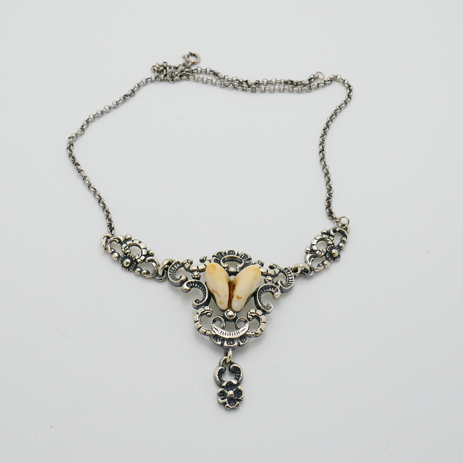 Het collier is gestempeld met 925 en het bewerkte deel met 835 en meesterteken dk of clk? in rechthoek