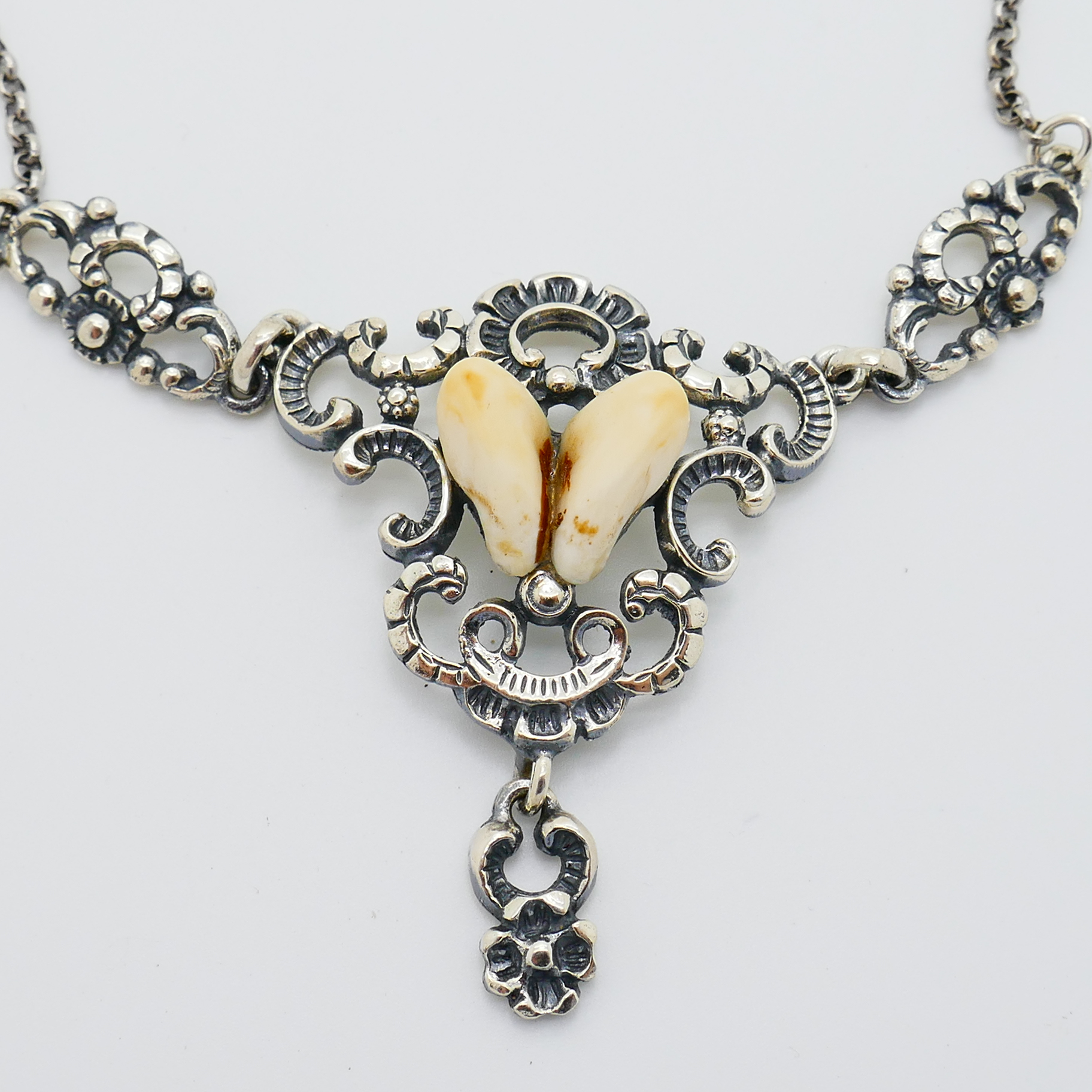 Het collier is 42 cm lang, het bewerkte middendeel is ca. 5 x 9 cm.