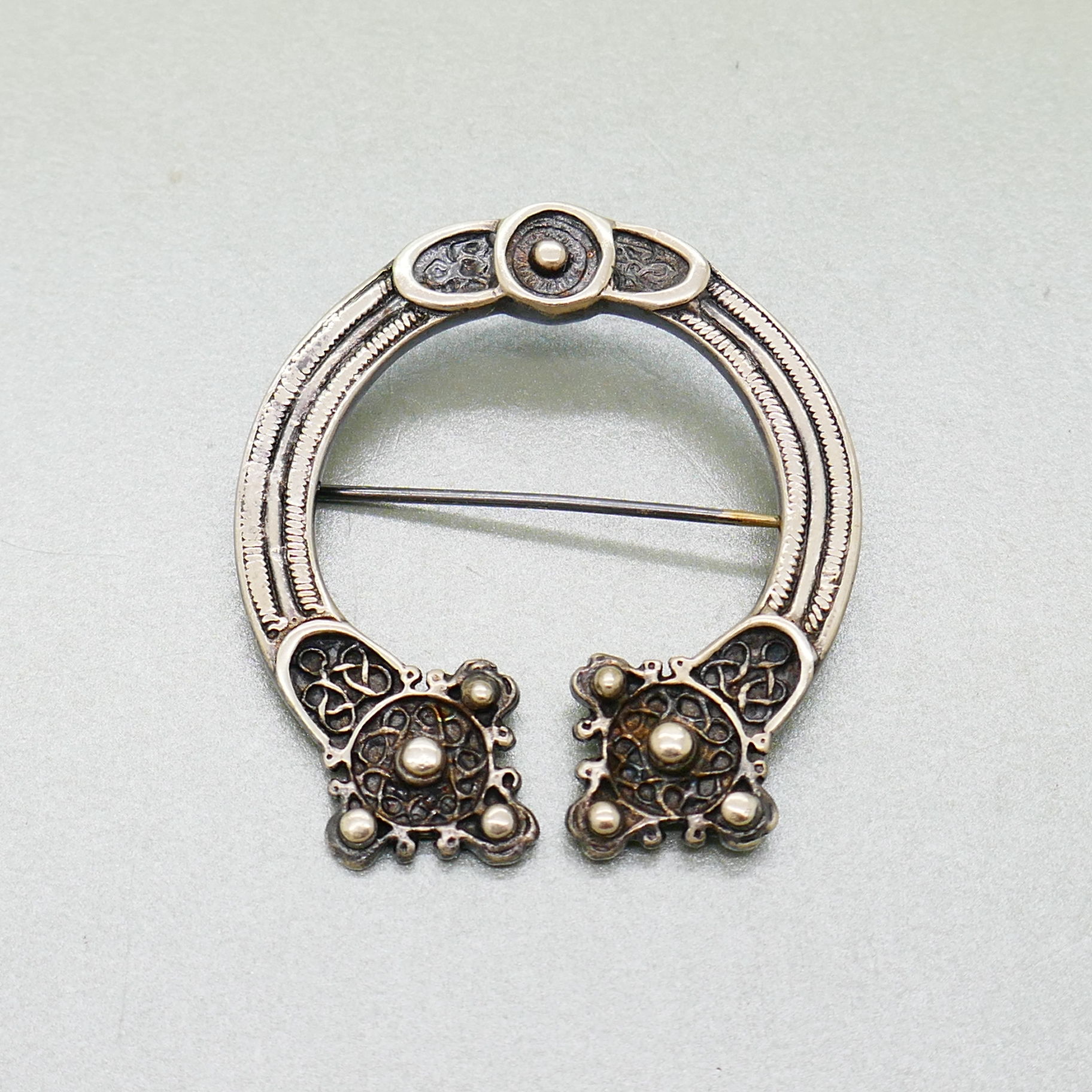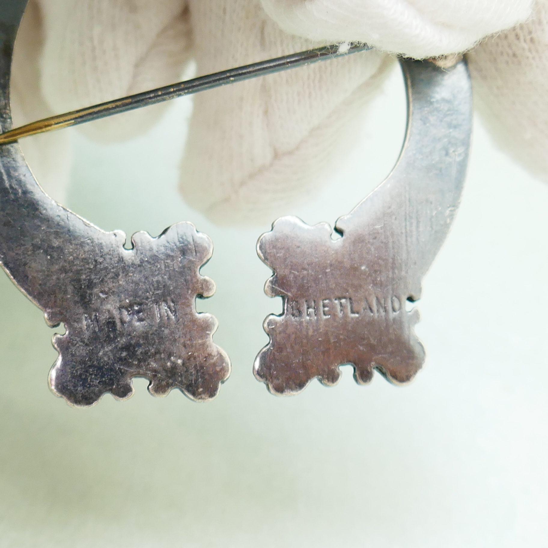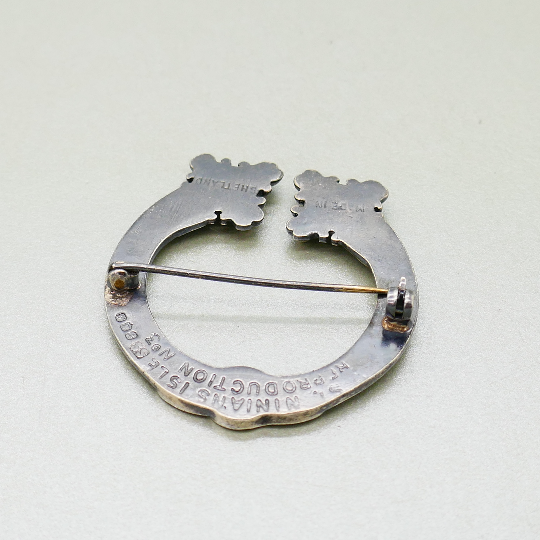 Een prachtige vintage zilveren broche in de vorm van een fibula/mantelspeld. De broche is gemaakt in Shetland en is een ontwerp naar een traditioneel motief van St. Ninnian’s Isle. De broche is gekeurd met Britse waarborgkeuren van Edinburgh en heeft jaarletter A van 1975.