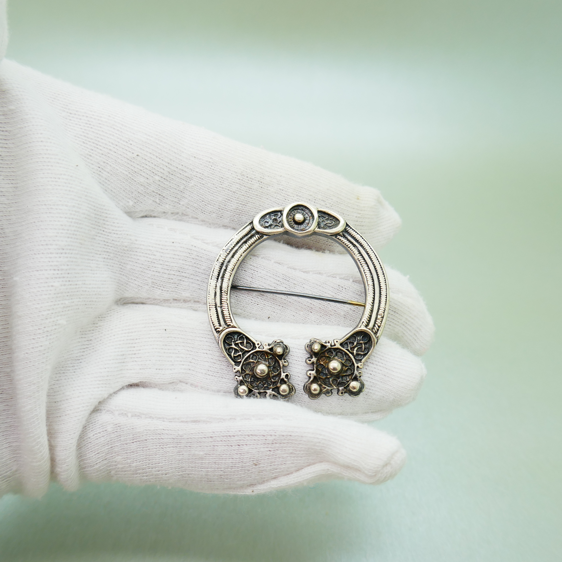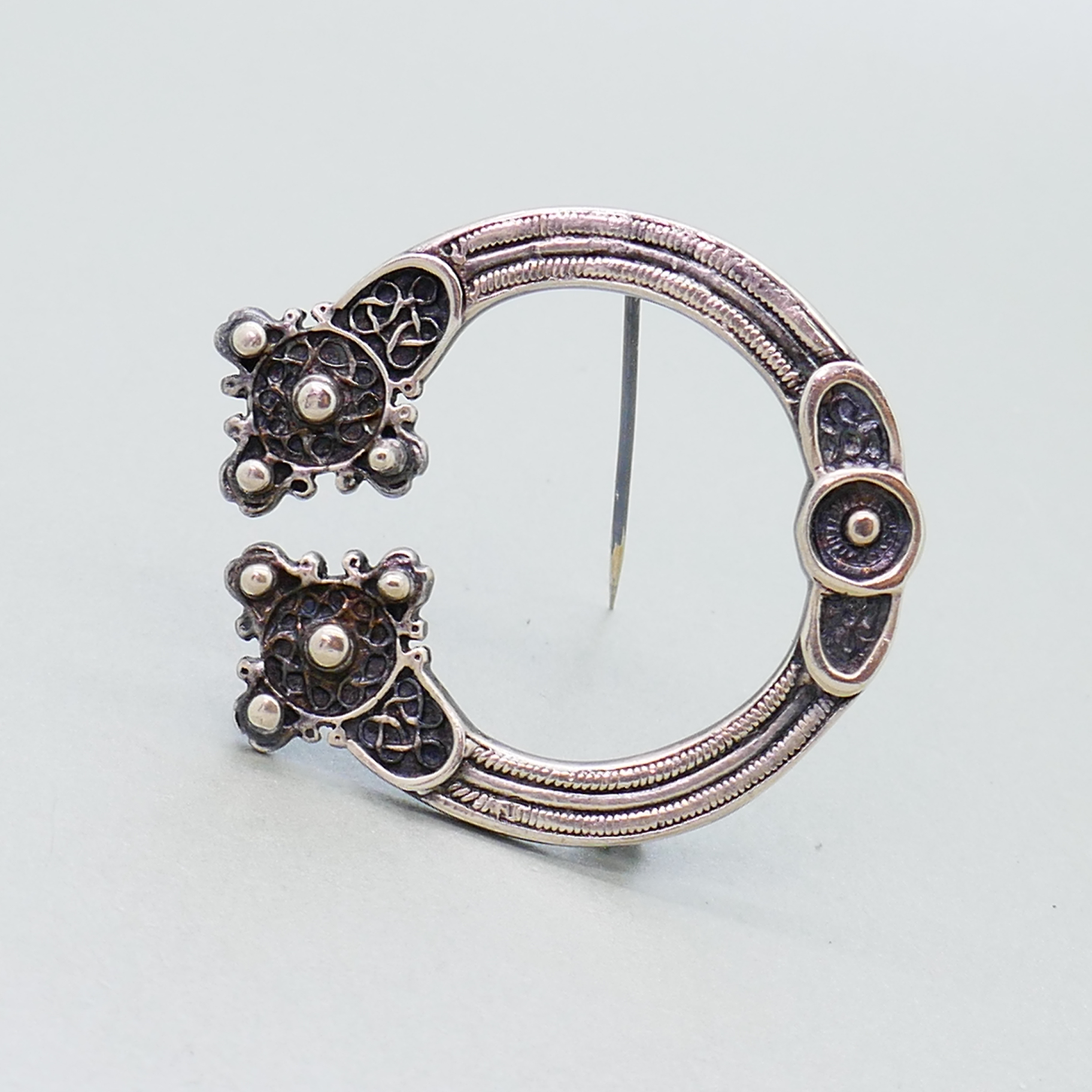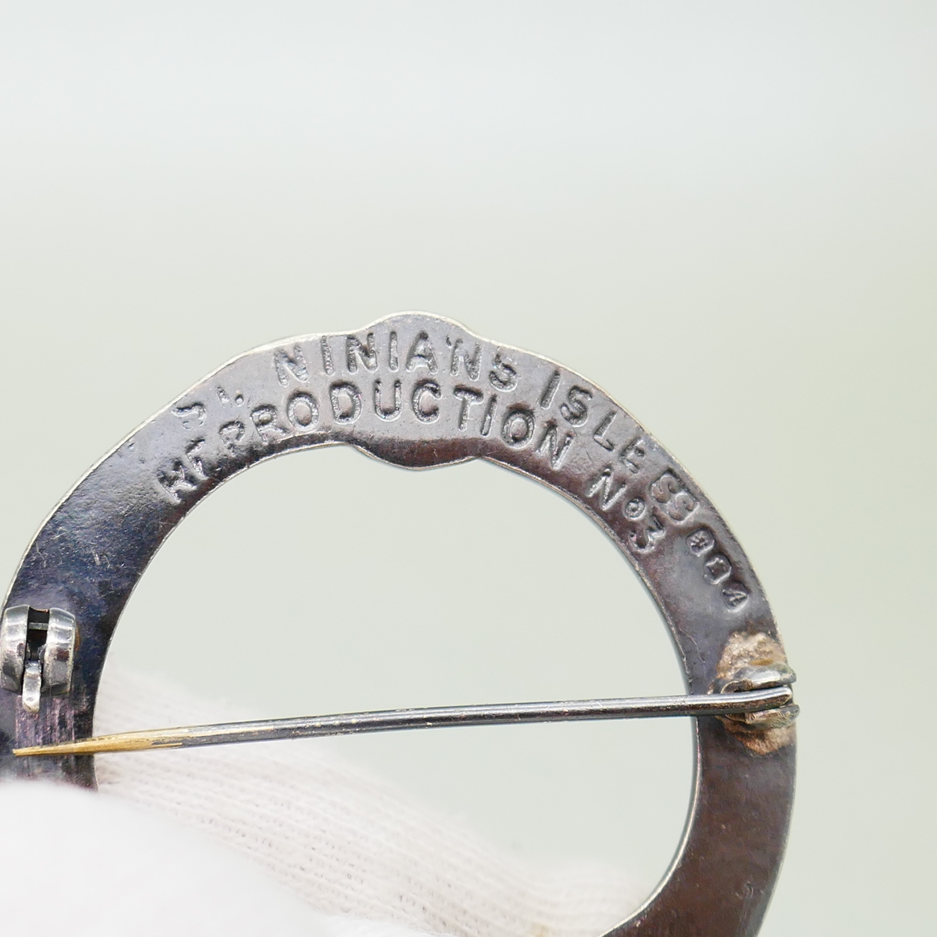 Een prachtige vintage zilveren broche in de vorm van een fibula/mantelspeld. De broche is gemaakt in Shetland en is een ontwerp naar een traditioneel motief van St. Ninnian’s Isle. De broche is gekeurd met Britse waarborgkeuren van Edinburgh en heeft jaarletter A van 1975.